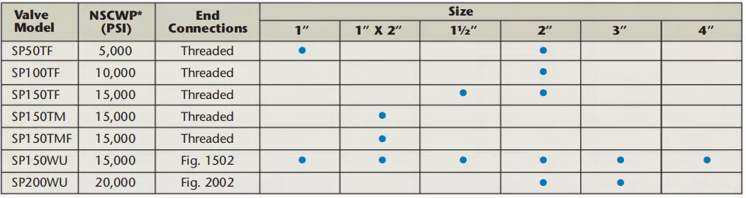 - 1"–2" Models: 15,000 PSI (standard) / 20,000 PSI (special order).
